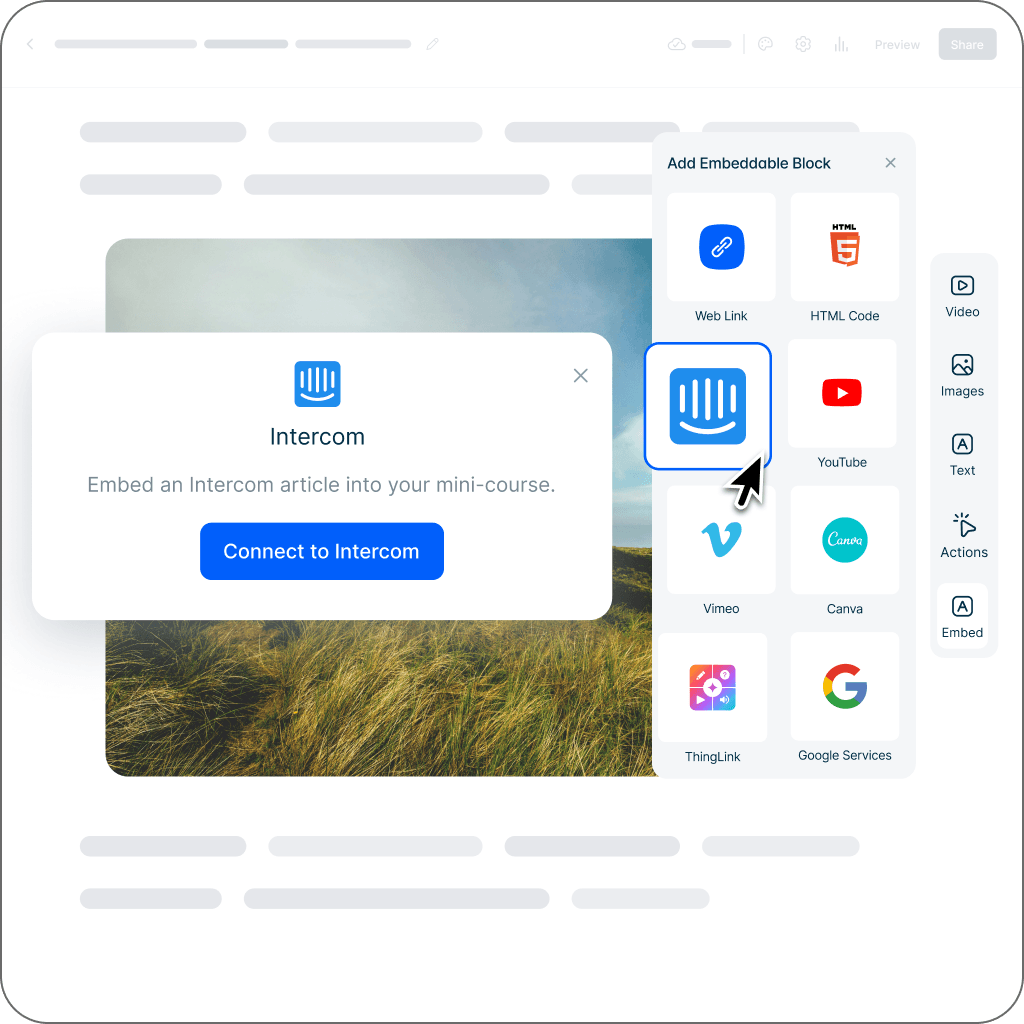 Embed Intercom articles and let AI convert it to a quiz. Content always shows the final version of the article due to live embed.